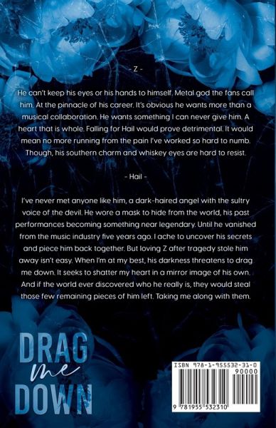 Drag Me Down is a full-length, mature MM (male/male) rockstar romance with dark themes. Z He can't keep his eyes or his hands to himself. Metal god, the fans call him. At the pinnacle of his career. It's obvious he wants more than a musical collaboration. He wants something I can never give him. A heart that is whole. Falling for Hail would prove detrimental. It would mean no more running from the pain I've worked so hard to numb. Though, his southern charm and whiskey eyes are becoming so hard to resist... Hail I've never met anyone like him, a dark-haired angel with the sultry voice of the devil. He wore a mask to hide from the world, his past performances becoming something near legendary. Until he vanished from the music industry. I ache to uncover his secrets and piece him back together. But loving Z after tragedy stole him away isn't easy. When I'm at my best, his darkness threatens to drag me down. It seeks to shatter my heart in a mirror image of his own. And if the world ever discovered who he really is, they would steal those few remaining pieces of him left, taking me along with them.