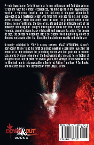Private Investigator David Drago is a former policeman and Gulf War veteran struggling with his combat experiences, his time spent in the psychological ward of a veterans' hospital, and the darkness of his past. When he is approached by a mysterious client who hires him to locate his missing fiancée, Jesse Greenlaw, Drago hesitantly takes the case. The problem, Jesse is also Drago's former girlfriend, the love of his life and still an intricate part of the darkness haunting him. Drago's investigation leads him into a labyrinth of violence, sexual intrigue, black witchcraft and hardcore Satanism. The deeper he digs, the deeper he descends into a dark netherworld haunted by visions of demons and angels alike that blurs the lines between reality and nightmare. Originally published in 2002 to strong reviews, Drago Descending, Gifune's noir-occult thriller (and his first published novella), essentially launched the career of a then unknown but promising author who has gone on to become considered by many to be one of the best writers of crime and horror fiction of his generation. Out of print for several years, this vintage Gifune work returns for the first time in this new Author's Preferred Edition from Down & Out Books, and features an all new introduction from Greg F. Gifune. Praise for DRAGO DESCENDING: "Drago Descending is the rarest breed of narrative-a story unaware of genre. Gifune's exploration of madness, spiritual warfare, pornography, and the paradoxical beauty and devastation of human relationships is a perfect marriage of form and subject. A first-rate thriller!" -Cemetery Dance Magazine "A perfect balance of hardboiled noir and occult horror, Greg F. Gifune's Drago Descending is a real page-turner, genuinely frightening and emotionally devastating. This is a genre-bending tale of lost love and madness you won't soon forget." -Sandy DeLuca, author of Descent "I don't care who you conjure-Marlowe, Spade, Hammer, Milodragovitch-Drago Descending is pure neo-noir joy, a quick throw-down on the sullied, mean streets. Supernatural Horror? Hardboiled Crime? Or a memoir from a guy sitting on the ward watching lizards crawl the walls? You decide." -The Crawford List Reviews "Greg F. Gifune is one of this generation's most talented authors. His unique blend of real life with surrealistic horror borders on genius. Drago Descending is a novella that is impossible to put down and will keep you guessing until the last page is turned. Highly recommended." -S. Joan Popek, author of Sound the Ram's Horn