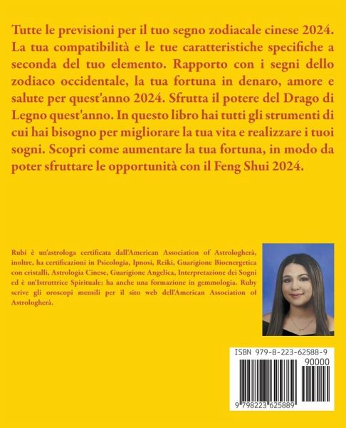 Tutte le previsioni per il tuo segno zodiacale cinese 2024. La tua compatibilità e le tue caratteristiche specifiche a seconda del tuo elemento. Rapporto con i segni dello zodiaco occidentale, la tua fortuna in denaro, amore e salute per quest'anno 2024. Sfrutta il potere del Drago di Legno quest'anno. In questo libro hai tutti gli strumenti di cui hai bisogno per migliorare la tua vita e realizzare i tuoi sogni. Scopri come aumentare la tua fortuna, in modo da poter sfruttare le opportunità con il Feng Shui 2024.
