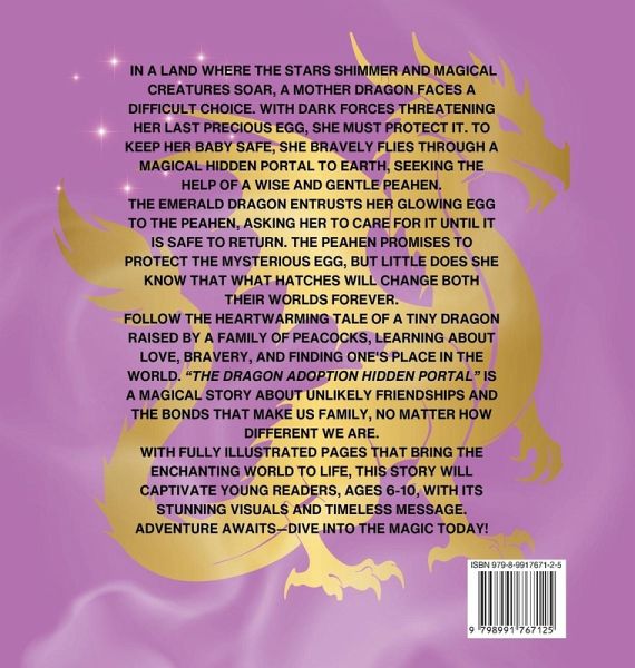 In a land where the stars shimmer and magical creatures soar, a mother dragon faces a difficult choice. With dark forces threatening her last precious egg, she must protect it. To keep her baby safe, she bravely flies through a magical portal to Earth, seeking the help of an unlikely friend-a wise and gentle peahen. On a quiet night, the mother dragon entrusts her glowing egg to the peahen, asking her to care for it until it is safe to return. The peahen promises to protect the mysterious egg, but little does she know that what hatches will change both their worlds forever. Follow the heartwarming tale of a tiny dragon raised by a family of peacocks, learning about love, bravery, and finding one's place in the world. Dragon Adoption Hidden Portal is a magical story about unlikely friendships and the bonds that make us family, no matter how different we are. With fully illustrated pages that bring the enchanting world to life, this story will captivate young readers, ages 6-10, with its stunning visuals and timeless message. Adventure awaits-dive into the magic today!