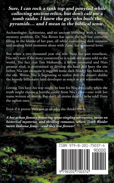 Sure, I can rock a tank top and ponytail while collecting ancient relics, but don't call me a tomb raider. I knew the guy who built the pyramids… and I mean in the biblical sense. Archaeologist, fashionista, and an ancient immortal with a serious memory problem, Dr. Nia Rivers has spent the last few centuries filling in the blanks of her past, all while outrunning dark assassins and stealing brief moments alone with Zane, her immortal lover. But when a two-thousand year old relic from her past resurfaces, Nia isn't sure if the story connected to it is one she wants told to the world. The fact that Tres Mohandis, a fellow immortal and Nia's greatest rival, is determined to develop the land and bury the site before Nia can excavate it suggests some dark history lies hidden in the site. Worse, Nia is beginning to realize that she doesn't dislike the broody billionaire land developer as much as she remembers. Letting Tres have his way might be best for Nia, especially when the truth might expose a horrific crime from Nia's past-one with her name written all over it. But don't all stories deserve to be told? Even the ugliest ones. Even if it proves she's not at all who she thinks she is. Get this hot urban fantasy featuring spine-tingling adventure, twists on historical mysteries, and thrilling romance, where Tomb Raider meets Indiana Jones-and they live forever!