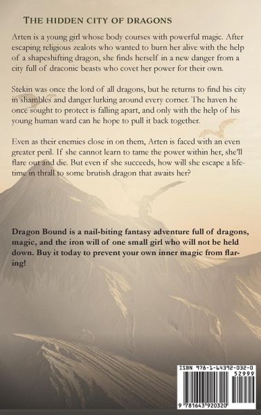 The hidden city of dragons. Arten is a young girl whose body courses with powerful magic. After escaping religious zealots who wanted to burn her alive with the help of a shapeshifting dragon, she finds herself in a new danger from a city full of draconic beasts who covet her power for their own. Stekin was once the lord of all dragons, but he returns to find his city in shambles and danger lurking around every corner. The haven he once sought to protect is falling apart, and only with the help of his young human ward can he hope to pull it back together. Even as their enemies close in on them, Arten is faced with an even greater peril. If she cannot learn to tame the power within her, she'll flare out and die. But even if she succeeds, how will she escape a lifetime in thrall to some brutish dragon that awaits her? Dragon Bound is a nail-biting fantasy adventure full of dragons, magic, and the iron will of one small girl who will not be held down. Buy it today to prevent your own inner magic from flaring!