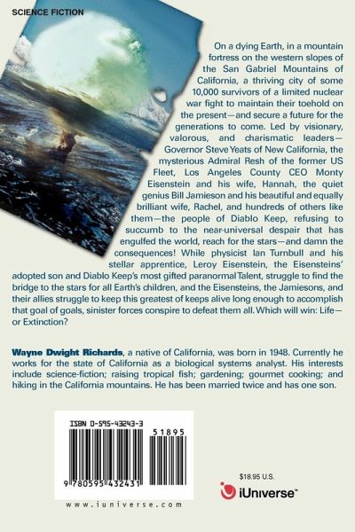 On a dying Earth, in a mountain fortress on the western slopes of the San Gabriel Mountains of California, a thriving city of some 10,000 survivors of a limited nuclear war fight to maintain their toehold on the present-and secure a future for the generations to come. Led by visionary, valorous, and charismatic leaders-Governor Steve Yeats of New California, the mysterious Admiral Resh of the former US Fleet, Los Angeles County CEO Monty Eisenstein and his wife, Hannah, the quiet genius Bill Jamieson and his beautiful and equally brilliant wife, Rachel, and hundreds of others like them-the people of Diablo Keep, refusing to succumb to the near-universal despair that has engulfed the world, reach for the stars-and damn the consequences! While physicist Ian Turnbull and his stellar apprentice, Leroy Eisenstein, the Eisensteins' adopted son and Diablo Keep's most gifted paranormal Talent, struggle to find the bridge to the stars for all Earth's children, and the Eisensteins, the Jamiesons, and their allies struggle to keep this greatest of keeps alive long enough to accomplish that goal of goals, sinister forces conspire to defeat them all. Who will win: Life-or extinction?