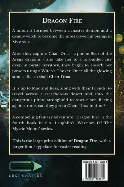 A union is formed between a master demon and a deadly witch to become the most powerful beings in Mystovia. After they capture Chan-Draa - a potent Seer of the Arega dragons - and take her to a forbidden city deep in pirate territory, they begin to absorb her powers using a Witch's Choker. Once all the glowing stones die, so shall Chan-Draa. It is up to Mac and Kess, along with their friends, to travel across a treacherous desert and into the dangerous pirate stronghold to rescue her. Racing against time, can they get to Chan-Draa in time? A compelling fantasy adventure, 'Dragon Fire' is the fourth book in S.A. Laughlin's 'Warriors Of The Mystic Moons' series. This is the large print edition of Dragon Fire, with a larger font / typeface for easier reading.
