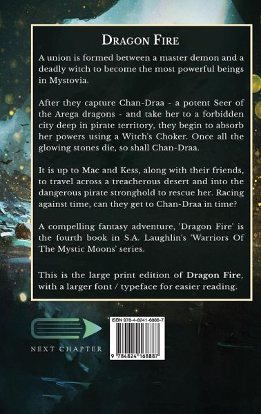 A union is formed between a master demon and a deadly witch to become the most powerful beings in Mystovia. After they capture Chan-Draa - a potent Seer of the Arega dragons - and take her to a forbidden city deep in pirate territory, they begin to absorb her powers using a Witch's Choker. Once all the glowing stones die, so shall Chan-Draa. It is up to Mac and Kess, along with their friends, to travel across a treacherous desert and into the dangerous pirate stronghold to rescue her. Racing against time, can they get to Chan-Draa in time? A compelling fantasy adventure, 'Dragon Fire' is the fourth book in S.A. Laughlin's 'Warriors Of The Mystic Moons' series. This is the large print edition of Dragon Fire, with a larger font / typeface for easier reading.