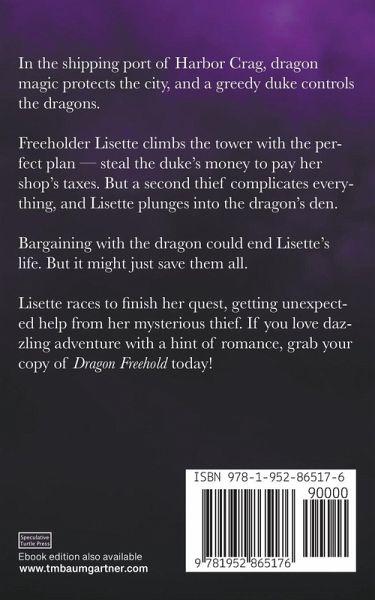 In the shipping port of Harbor Crag, dragon magic protects the city, and a greedy duke controls the dragons. Freeholder Lisette climbs the tower with the perfect plan - steal the duke's money to pay her shop's taxes. But a second thief complicates everything, and Lisette plunges into the dragon's den. Bargaining with the dragon could end Lisette's life. But it might just save them all. Lisette races to finish her quest, getting unexpected help from her mysterious thief. If you love dazzling adventure with a hint of romance, grab your copy of Dragon Freehold today!