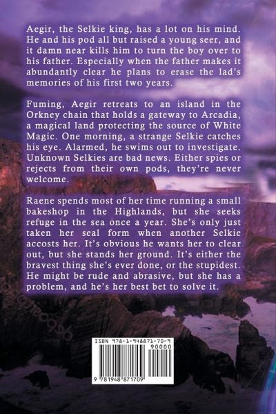 Aegir, the Selkie king, has a lot on his mind. He and his pod all but raised a young seer, and it damn near kills him to turn the boy over to his father. Especially when the father makes it abundantly clear he plans to erase the lad's memories of his first two years. Fuming, Aegir retreats to an island in the Orkney chain that holds a gateway to Arcadia, a magical land protecting the source of White Magic. One morning, a strange Selkie catches his eye. Alarmed, he swims out to investigate. Unknown Selkies are bad news. Either spies or rejects from their own pods, they're never welcome. Raene spends most of her time running a small bakeshop in the Highlands, but she seeks refuge in the sea once a year. She's only just taken her seal form when another Selkie accosts her. It's obvious he wants her to clear out, but she stands her ground. It's either the bravest thing she's ever done, or the stupidest. He might be rude and abrasive, but she has a problem, and he's her best bet to solve it.