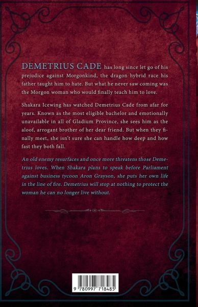 Demetrius Cade has long since let go of his prejudice against Morgonkind, the dragon hybrid race his father taught him to hate. But what he never saw coming was the Morgon woman who would finally teach him to love. Shakara Icewing has watched Demetrius Cade from afar for years. Known as the most eligible bachelor and emotionally unavailable in all of Gladium Province, she sees him as the aloof, arrogant brother of her dear friend. But when they finally meet, she isn’t sure she can handle how deep and how fast they both fall. An old enemy resurfaces and once more threatens those Demetrius loves. When Shakara plans to speak before Parliament against business tycoon Aron Grayson, she puts her own life in the line of fire. Demetrius will stop at nothing to protect the woman he can no longer live without.