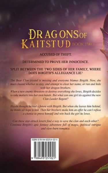 Accused of theft. Determined to prove her innocence. Split between the two sides of her family, where does Birgith's allegiance lie? The Bear Clan crystal is missing and everyone blames Birgith. Now, she must choose whether to stay, and attempt to clear her name, or run and hide with her dragon brothers. When a new enemy threatens to destroy everything she loves, Birgith decides to take matters into her own hands. But what can one girl do against the new Clan Leader Regent? Haydn thought he had a future with Birgith. But when she leaves him behind, he thinks all hope is lost. Then her brothers make him an offer he can't refuse - a chance to prove himself and win back the girl he loves. Can these star-struck lovers find a way to save the clan and each other? Continue Birgith's epic fantasy adventure full of magic, political intrigue and slow-burn romance.
