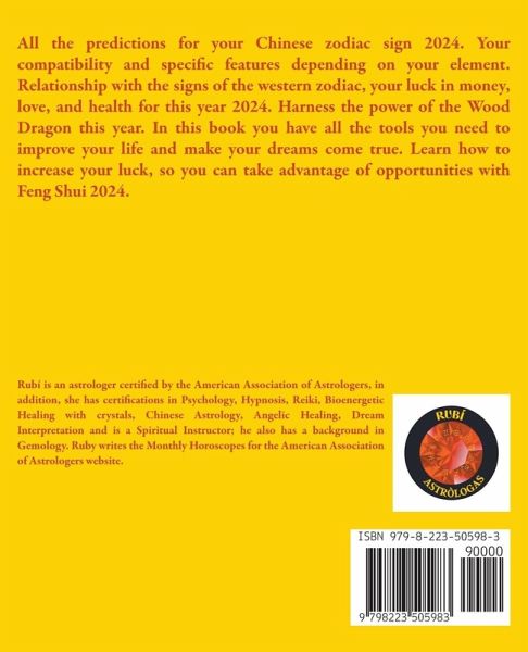 All the predictions for your Chinese zodiac sign 2024. Your compatibility and specific features depending on your element. Relationship with the signs of the western zodiac, your luck in money, love, and health for this year 2024. Harness the power of the Wood Dragon this year. In this book you have all the tools you need to improve your life and make your dreams come true. Learn how to increase your luck, so you can take advantage of opportunities with Feng Shui 2024.
