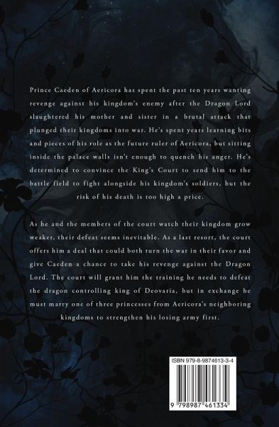Prince Caeden of Aericora has spent the past ten years wanting revenge against his kingdom's enemy after the Dragon Lord slaughtered his mother and sister in a brutal attack that plunged their kingdoms into war. He's spent years learning bits and pieces of his role as the future ruler of Aericora, but sitting inside the palace walls isn't enough to quench his anger. He's determined to convince the King's Court to send him to the battle field to fight alongside his kingdom's soldiers, but the risk of his death is too high a price. As he and the members of the court watch their kingdom grow weaker, their defeat seems inevitable. As a last resort, the court offers him a deal that could both turn the war in their favor and give Caeden a chance to take his revenge against the Dragon Lord. The court will grant him the training he needs to defeat the dragon controlling king of Deovaria, but in exchange he must marry one of three princesses from Aericora's neighboring kingdoms to strengthen his losing army first.