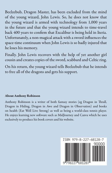Beelzebub, Dragon Master, has been excluded from the mind of the young wizard, John Lewis. So, he does not know that the young wizard is armed with technology from 1,000 years in the future and that the young wizard intends to time-travel back 400 years to confirm that Excalibur is being held in Iteria. Unfortunately, a non-magical attack with a sword influences the space-time continuum when John Lewis is so badly injured that he loses his memory. Finally. John Lewis recovers with the help of yet another girl cousin and creates copies of the sword, scabbard and Celtic ring. On his return, the young wizard tells Beelzebub that he intends to free all of the dragons and gets his support.