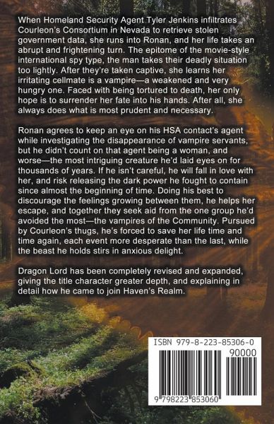 When Homeland Security Agent Tyler Jenkins infiltrates Courleon's Consortium in Nevada to retrieve stolen government data, she runs into Ronan, and her life takes an abrupt and frightening turn. The epitome of the movie-style international spy type, the man takes their deadly situation too lightly. After they're taken captive, she learns her irritating cellmate is a vampire—a weakened and very hungry one. Faced with being tortured to death, her only hope is to surrender her fate into his hands. After all, she always does what is most prudent and necessary. Ronan agrees to keep an eye on his HSA contact's agent while investigating the disappearance of vampire servants, but he didn't count on that agent being a woman, and worse—the most intriguing creature he'd laid eyes on for thousands of years. If he isn't careful, he will fall in love with her, and risk releasing the dark power he fought to contain since almost the beginning of time. Doing his best to discourage the feelings growing between them, he helps her escape, and together they seek aid from the one group he'd avoided the most—the vampires of the Community. Pursued by Courleon's thugs, he's forced to save her life time and time again, each event more desperate than the last, while the beast he holds stirs in anxious delight. Dragon Lord has been completely revised and expanded, giving the title character greater depth, and explaining in detail how he came to join Haven's Realm.