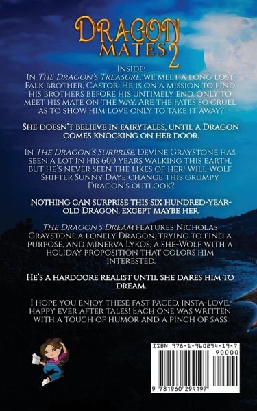 Dear reader, Thank you for grabbing Dragon Mates 2: The Falk Clan Tales Books 5-7. Inside: In The Dragon's Treasure, we meet a long lost Falk brother, Castor. He is on a mission to find his brothers before his untimely end, only to meet his mate on the way. Are the Fates so cruel as to show him love only to take it away? She doesn't believe in fairytales, until a Dragon comes knocking on her door. In The Dragon's Surprise, Devine Graystone has seen a lot in his 600 years walking this earth, but he's never seen the likes of her! Will Wolf Shifter Sunny Daye change this grumpy Dragon's outlook? Nothing can surprise this six hundred-year-old Dragon, except maybe her. The Dragon's Dream features Nicholas Graystone,a lonely Dragon, trying to find a purpose, and Minerva Lykos, a she-Wolf with a holiday proposition that colors him interested. He's a hardcore realist until she dares him to dream. I hope you enjoy these fast paced, insta-love, happy ever after tales! Each one was written with a touch of humor and a pinch of sass. del mare alla stella, C.D. Gorri *Find out if these grumpy Dragons can keep the feisty females who steal their Dragons' hearts in the pages ahead.