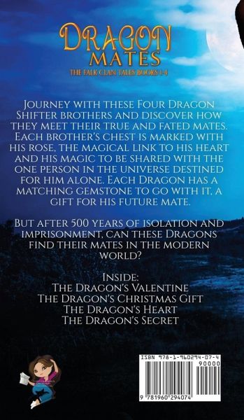 Journey with these Four Dragon Shifter brothers and discover how they meet their true and fated mates. Each brother's chest is marked with his rose, the magical link to his heart and his magic to be shared with the one person in the universe destined for him alone. Each Dragon has a matching gemstone to go with it, a gift for his future mate. But after 500 years of isolation and imprisonment, can these Dragons find their mates in the modern world? Inside: The Dragon's Valentine The Dragon's Christmas Gift The Dragon's Heart The Dragon's Secret