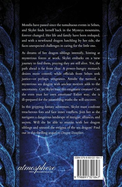 Months have passed since the tumultuous events in Selnes, and Skylet finds herself back in the Mysteya mountains, forever changed. Her life and family have been reshaped, and with a newfound dragon hatchling by her side, she faces unexpected challenges in caring for the little one. As dreams of her dragon siblings intensify, hinting at mysterious forces at work, Skylet embarks on a new journey to find them, praying they are still alive. Yet, the path ahead is far from clear. A power-hungry monarch desires more control, while officials from Selnes seek justice-or perhaps vengeance. Amidst the turmoil, a mysterious sea dragon with unclear motives adds to the uncertainty. Can Skylet trust this enigmatic creature? Can she even trust her own emotions? Either way, she is ill-prepared for the astonishing truths she will uncover. In this gripping fantasy adventure, Skylet must confront treacherous foes and face inner conflicts. Join her as she navigates a dangerous landscape of intrigue, alliances, and secrets. Will she be able to reunite with her dragon siblings and unravel the enigma of the sea dragon? Find out in this thrilling sequel to Dragon Daughter.