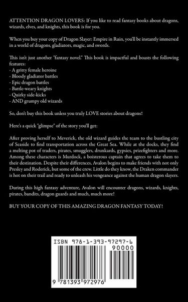 ATTENTION DRAGON LOVERS: If you like to read fantasy books about dragons, wizards, elves, and knights, this book is for you. When you buy your copy of Dragon Slayer: Empire in Ruin, you'll be instantly immersed in a world of dragons, gladiators, magic, and swords. This isn't just another "fantasy novel." This book is impactful and boasts the following features: - A gritty female heroine - Bloody gladiator battles - Epic dragon battles - Battle-weary knights - Quirky side-kicks - AND grumpy old wizards So, don't buy this book unless you truly LOVE stories about dragons! Here's a quick "glimpse" of the story you'll get: After proving herself to Meverick, the old wizard guides the team to the bustling city of Seaside to find transportation across the Great Sea. While at the docks, they find a melting pot of traders, pirates, smugglers, drunkards, gypsies, prizefighters and more. Among these characters is Murdock, a boisterous captain that agrees to take them to their destination. Despite their differences, Avalon begins to make friends with not only Presley and Roderick, but some of the crew. Little do they know, the Draken commander is hot on their trail and ready to unleash his vengeance against the human dragon slayers. During this high fantasy adventure, Avalon will encounter dragons, wizards, knights, pirates, bandits, dragon guards and much, much more! BUY YOUR COPY OF THIS AMAZING DRAGON FANTASY TODAY!