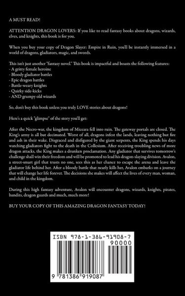 A MUST READ! ATTENTION DRAGON LOVERS: If you like to read fantasy books about dragons, wizards, elves, and knights, this book is for you. When you buy your copy of Dragon Slayer: Empire in Ruin, you'll be instantly immersed in a world of dragons, gladiators, magic, and swords. This isn't just another "fantasy novel." This book is impactful and boasts the following features: - A gritty female heroine - Bloody gladiator battles - Epic dragon battles - Battle-weary knights - Quirky side-kicks - AND grumpy old wizards So, don't buy this book unless you truly LOVE stories about dragons! Here's a quick "glimpse" of the story you'll get: After the Necro-war, the kingdom of Miceara fell into ruin. The gateway portals are closed. The King's army is all but decimated. Worst of all, dragons infest the lands, leaving nothing but fire and ash in their wake. Disgraced and disfigured by the giant serpents, the King spends his days watching gladiators fight to the death in the Collesium. After receiving troubling news of more dragon attacks, the King makes a drunken proclamation. Any gladiator that survives tomorrow's challenge shall win their freedom and will be promoted to lead his dragon-slaying division. Avalon, a street-smart girl that trusts no one, sees this as her chance to escape the arena and leave the gladiator life behind her. After a bloody battle that nearly kills her, Avalon embarks on a journey that will change her life forever. The decisions she makes will affect the lives of every man, woman, and child in the kingdom. During this high fantasy adventure, Avalon will encounter dragons, wizards, knights, pirates, bandits, dragon guards and much, much more! BUY YOUR COPY OF THIS AMAZING DRAGON FANTASY TODAY!