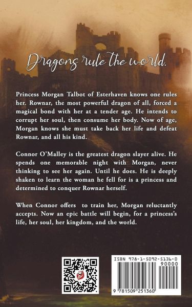 Dragons rule the world. Princess Morgan Talbot of Esterhaven knows one rules her. Rownar, the most powerful dragon of all, forced a magical bond with her at a tender age. He intends to corrupt her soul, then consume her body. Now of age, Morgan knows she must take back her life and defeat Rownar, and all his kind. Connor O'Malley is the greatest dragon slayer alive. He spends one memorable night with Morgan, never thinking to see her again. Until he does. He is deeply shaken to learn the woman he fell for is a princess and determined to conquer Rownar herself. When Connor offers to train her, Morgan reluctantly accepts. Now an epic battle will begin, for a princess's life, her soul, her kingdom, and the world.