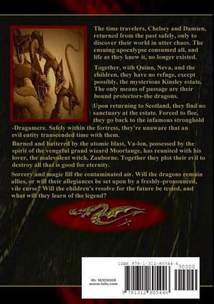 The Dragonspawn Saga ~ Book Five (of Five) Chelsey and Damien, returned from the past safely, only to discover their world in utter chaos. The ensuing apocalypse consumed all, and life as they knew it, no longer existed. Together, with Quinn, Neva, and the children, they have no refuge, except possibly, the mysterious Kinsley estate. The only means of passage are their bound protectors-the dragons. Upon returning to Scotland, they find no sanctuary at the estate. Forced to flee, they go back to the infamous stronghold-Dragamere. Safely within the fortress, they're unaware that an evil entity transcended time with them. Burned and battered by the atomic blast, Va-lon, possessed by the spirit of the vengeful grand wizard Moorlange, has reunited with his lover, the malevolent witch, Zauborne. Will the dragons remain allies, or will their allegiances be set upon by a freshly-pronounced, vile curse? Will the children's resolve for the future be tested, and what will they learn of the legend?
