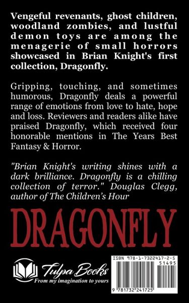 Vengeful revenants, ghost children, woodland zombies, and lustful demon toys are among the menagerie of small horrors showcased in Brian Knight's first collection, Dragonfly. Gripping, touching, and sometimes humorous, Dragonfly deals a powerful range of emotions from love to hate, hope and loss. Reviewers and readers alike have praised Dragonfly, which received four honorable mentions in The Years Best Fantasy & Horror. "Brian Knight's writing shines with a dark brilliance. Dragonfly is a chilling collection of terror." Douglas Clegg, author of The Children's Hour