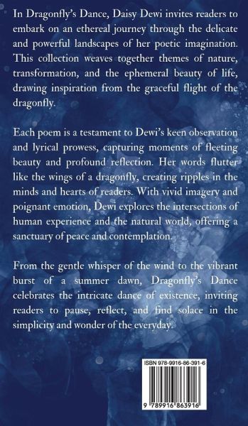 In Dragonfly's Dance, Daisy Dewi invites readers to embark on an ethereal journey through the delicate and powerful landscapes of her poetic imagination. This collection weaves together themes of nature, transformation, and the ephemeral beauty of life, drawing inspiration from the graceful flight of the dragonfly. Each poem is a testament to Dewi's keen observation and lyrical prowess, capturing moments of fleeting beauty and profound reflection. Her words flutter like the wings of a dragonfly, creating ripples in the minds and hearts of readers. With vivid imagery and poignant emotion, Dewi explores the intersections of human experience and the natural world, offering a sanctuary of peace and contemplation. From the gentle whisper of the wind to the vibrant burst of a summer dawn, Dragonfly's Dance celebrates the intricate dance of existence, inviting readers to pause, reflect, and find solace in the simplicity and wonder of the everyday. Copyright (c) 2024 Swan Charm Publishing