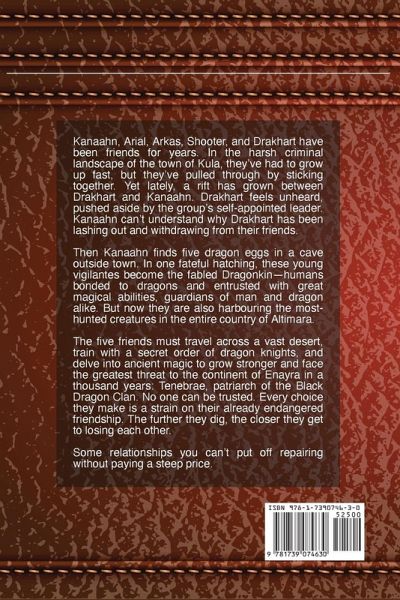 Kanaahn, Arial, Arkas, Shooter, and Drakhart have been friends for years. In the harsh criminal landscape of the town of Kula, they've had to grow up fast, but they've pulled through by sticking together. Yet lately, a rift has grown between Drakhart and Kanaahn. Drakhart feels unheard, pushed aside by the group's self-appointed leader. Kanaahn can't understand why Drakhart has been lashing out and withdrawing from their friends. Then Kanaahn finds five dragon eggs in a cave outside town. In one fateful hatching, these young vigilantes become the fabled Khaleeshir-humans bonded to dragons and entrusted with great magical abilities, guardians of man and dragon alike. They are also harbouring the most-hunted creatures in the entire country of Altimara. The five friends must travel across a vast desert, train with a hidden dragon council, and delve into ancient magic to learn their destiny and prepare to face the greatest threat to the continent of Enayra in a thousand years: Tenebrae, the human-despising black dragon who perfected the forbidden Blood Magic. No one can be trusted. Every choice they make is a strain on their already endangered friendship. The further they dig, the closer they get to losing each other. Some relationships you can't put off repairing without paying a steep price.
