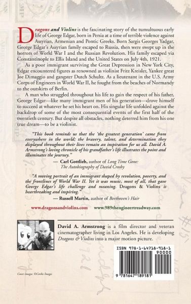 Dragons & Violins is a narrative nonfiction account of the tumultuous early life of George Edgar, who was born in Persia (now Iran) at a time when Turks & Kurds were determinedly carrying out unimaginable violence against Assyrian, Armenian and Pontic Greek Christians. Born Sargis Georges Yadgar, George Edgar's Assyrian family escaped to southern Russia, where they were caught up in the chaos of World War I and the Russian revolution and civil war. They eventually escaped to Constantinople, and finally made their way to Ellis Island and the United States on July 4th, 1921. As a poor immigrant kid surviving the Great Depression in New York, he encountered figures as renowned as violinist Fritz Kreisler, Yankee great Joe Dimaggio, and gangster Dutch Schultz. He married the beautiful ""Miss Assyria"" of the 1933 Chicago World's Fair, and was barred from participating as a gymnast in the 1936 Olympics because he wasn't a native-born American. But as a lieutenant in the U.S. Army Corps of Engineers in World War II, he helped build dozens of assault bridges in combat at the front lines of the Allies’ push from the beaches of Normandy to the outskirts of Berlin. A man who struggled throughout his life to gain the respect of his father, George Edgar, like many immigrant men of his generation, drove himself to succeed at whatever he set his heart on. His singular life unfolded against the backdrop of some of the most consequential events of the first half of the twentieth century. But despite all obstacles, nothing deterred him from his one true dream...to be a violinist.