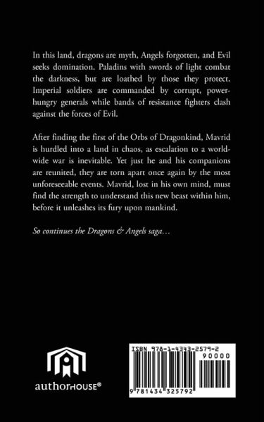 In this land, dragons are myth, Angels forgotten, and Evil seeks domination. Paladins with swords of light combat the darkness, but are loathed by those they protect. Imperial soldiers are commanded by corrupt, power-hungry generals while bands of resistance fighters clash against the forces of Evil.After finding the first of the Orbs of Dragonkind, Mavrid is hurdled into a land in chaos, as escalation to a worldwide war is inevitable. Yet just he and his companions are reunited, they are torn apart once again by the most unforeseeable events. Mavrid, lost in his own mind, must find the strength to understand this new beast within him, before it unleashes its fury upon mankind. So continues the Dragons and Angels saga.