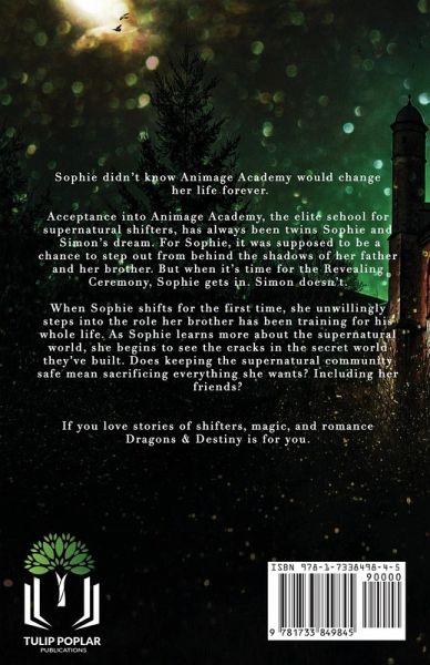 Sophie didn't know Animage Academy would change her life forever. Acceptance into Animage Academy, the elite school for supernatural shifters, has always been twins Sophie and Simon's dream. For Sophie, it was supposed to be a chance to step out from behind the shadows of her father and her brother. But when it's time for the Revealing Ceremony, Sophie gets in. Simon doesn't. When Sophie shifts for the first time, she unwillingly steps into the role her brother has been training for his whole life. As Sophie learns more about the supernatural world, she begins to see the cracks in the secret world they've built. Does keeping the supernatural community safe mean sacrificing everything she wants? Including her friends? If you love stories of shifters, magic, and romance Dragons & Destiny is for you.
