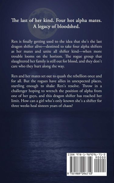 Ren is finally getting used to the idea that she's the last dragon shifter alive-destined to take four alpha shifters as her mates and unite all shifter kind-when more trouble looms on the horizon. The rogue group that slaughtered her family is still out for blood, and they don't care who they hurt along the way. Ren and her mates set out to quash the rebellion once and for all. But the rogues have allies in unexpected places, startling enough to shake Ren's resolve. Throw in a challenger hoping to wrench the position of alpha from one of her guys, and this dragon shifter has reached her limit. How can a girl who's only known she's a shifter for three weeks heal sixteen years of chaos?