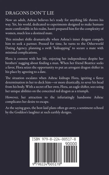 Now an adult, Ashrac believes he's ready for anything life throws his way. Yet, his world, dedicated to experiments designed to make humans more comfortable in his realm, hasn't prepared him for the complexity of women, much less a destined mate. This mindset shifts dramatically when Ashrac's inner dragon compels him to seek a partner. Pressed for time, he turns to the Otherworld Dating Agency, planning a swift "kidnapping" to secure a mate with minimal complications. Flora is content with her life, enjoying her independence despite her brothers' nagging about finding a man. When her friend Beatrice seeks a favor, Flora seizes the opportunity to put an arrogant dragon shifter in his place by agreeing to a date. The situation escalates when Ashrac kidnaps Flora, igniting a fierce determination in her to deck him-or more drastically, to sever his head from his body. With a secret of her own, Flora, an eagle shifter, sees using her unique abilities on the conceited red dragon as a triumph. However, her attraction to the infuriatingly handsome Ashrac complicates her desire to escape. As the saying goes, the best-laid plans often go awry, a sentiment echoed by the Goddess's laughter at such earthly designs. "Dragons Don't Lie" unfolds this tumultuous tale, revealing the unpredictable dance of fate. Conclusion to the Fire Chronicles Dragon Series