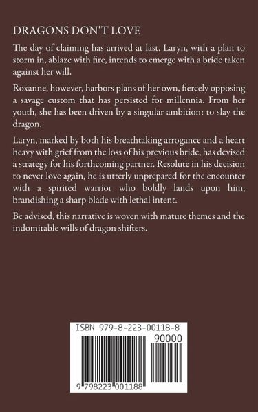 The day of claiming has arrived at last. Laryn, with a plan to storm in, ablaze with fire, intends to emerge with a bride taken against her will. Roxanne, however, harbors plans of her own, fiercely opposing a savage custom that has persisted for millennia. From her youth, she has been driven by a singular ambition: to slay the dragon. Laryn, marked by both his breathtaking arrogance and a heart heavy with grief from the loss of his previous bride, has devised a strategy for his forthcoming partner. Resolute in his decision to never love again, he is utterly unprepared for the encounter with a spirited warrior who boldly lands upon him, brandishing a sharp blade with lethal intent. Be advised, this narrative is woven with mature themes and the indomitable wills of dragon shifters.