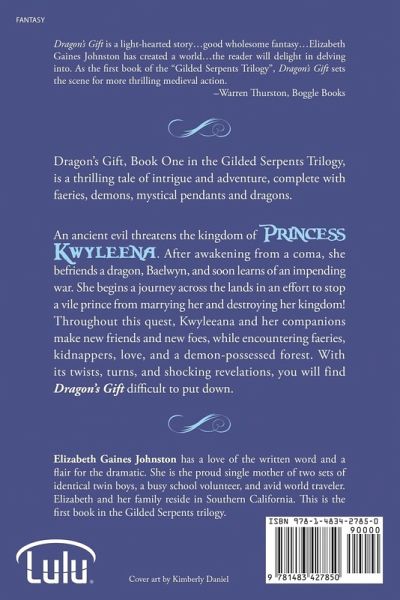 Dragon's Gift, Book One in the Gilded Serpents Trilogy, is a thrilling tale of intrigue and adventure, complete with faeries, demons, mystical pendants and dragons. An ancient evil threatens the kingdom of Princess Kwyleena. After awakening from a coma, she befriends a dragon, Baelwyn, and soon learns of an impending war. She begins a journey across the lands in an effort to stop a vile prince from marrying her and destroying her kingdom! Throughout this quest, Kwyleeana and her companions make new friends and new foes, while encountering faeries, kidnappers, love, and a demon-possessed forest. With its twists, turns, and shocking revelations, you will find Dragon's Gift difficult to put down.