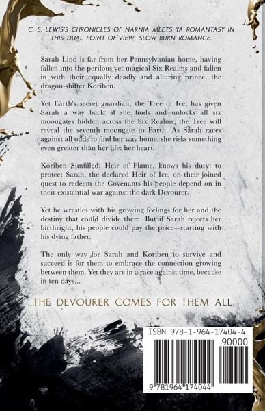 Two Heirs, one quest. . . . Sarah Lind is far from her Pennsylvanian home, having fallen into the perilous yet magical Six Realms and fallen in with their equally deadly and alluring prince, the dragon-shifter Koriben. Yet Earth's secret guardian, the Tree of Ice, has given Sarah a way back: if she finds and unlocks all six moongates hidden across the Six Realms, the Tree will reveal the seventh moongate to Earth. As Sarah races against all odds to find her way home, she risks something even greater than her life: her heart. Koriben Sunfilled, Heir of Flame, knows his duty: to protect Sarah, the declared Heir of Ice, on their joined quest to redeem the Covenants his people depend on in their existential war against the dark Devourer. Yet he wrestles with his growing feelings for her and the destiny that could divide them. But if Sarah rejects her birthright, his people could pay the price-starting with his dying father. The only way for Sarah and Koriben to survive and succeed is for them to embrace the connection growing between them. Yet they are in a race against time, because in ten days . . . . . . the Devourer comes for them all.
