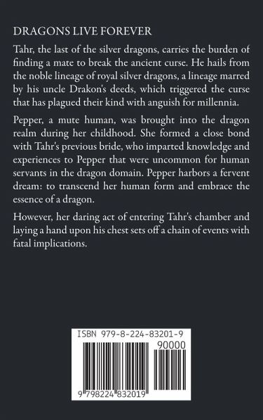 Tahr, the last of the silver dragons, carries the burden of finding a mate to break the ancient curse. He hails from the noble lineage of royal silver dragons, a lineage marred by his uncle Drakon's deeds, which triggered the curse that has plagued their kind with anguish for millennia. Pepper, a mute human, was brought into the dragon realm during her childhood. She formed a close bond with Tahr's previous bride, who imparted knowledge and experiences to Pepper that were uncommon for human servants in the dragon domain. Pepper harbors a fervent dream: to transcend her human form and embrace the essence of a dragon. However, her daring act of entering Tahr's chamber and laying a hand upon his chest sets off a chain of events with fatal implications.