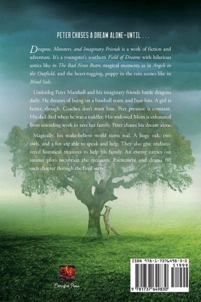 Magic happens when make-believe becomes real. Dragons, Monsterrs, and Imaginary Friends is a work of fiction and adventure for young adult and up. It's a youngster's southern Field of Dreams with hilarious antics like in The Bad News Bears, magical moments as in Angels in the Outfield, and the heart-tugging, puppy in the rain scenes like in Blind Side. Dragons... is a blend of play time in the woods, dreams and underdog days, family life tradegies, historical treasure, sinister actions, and heroism. Over one hundred sketches and photos enhance a reader's vision of the drama as it plays out. Underdog Peter Marshall battles dragons with imaginary friends. His hero is his dad, who died when he was a toddler. Peter dreams of base hits like his dad. Coaches don't want him, though, as his skills were pitiful. A girl was much better. Peer pressure is constant. His widowed mom is buried in work and trying to save her family. Peter chases his dream alone. His make believe turns real as his imaginary friends-an oak, two owls, and a fox-come to his rescue. They are able to talk with him and help with valuable historic Indian and Spanish treasures for the family. An adult enemy carries out sinister plots to obtain the treasures. The setting is in the historic woods of Tallahassee, Florida. Excitement and drama fill each chapter through the final scene.