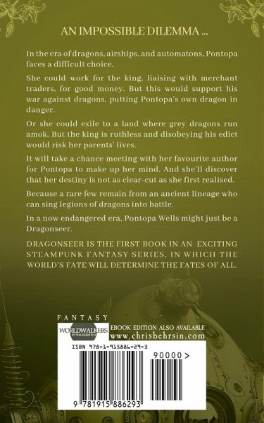 An impossible dilemma ... In the era of dragons, airships, and automatons, Pontopa faces a difficult choice. She could work for the king, liaising with merchant traders, for good money. But this would support his war against dragons, putting Pontopa's own dragon in danger. Or she could exile to a land where grey dragons run amok. But the king is ruthless and disobeying his edict would risk her parents' lives. It will take a chance meeting with her favourite author for Pontopa to make up her mind. And she'll discover that her destiny is not as clear-cut as she first realised. Because a rare few remain from an ancient lineage who can sing legions of dragons into battle. In a now endangered era, Pontopa Wells might just be a Dragonseer. Dragonseer is the first book in an exciting steampunk fantasy series in which the world's fate will determine the fates of all.