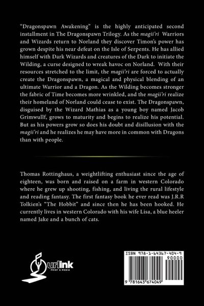 "Dragonspawn Awakening" is the highly anticipated second installment in The Dragonspawn Trilogy. As the magii'ri Warriors and Wizards return to Norland they discover Timon's power has grown despite his near defeat on the Isle of Serpents. He has allied himself with Dark Wizards and creatures of the Dark to initiate the Wilding, a curse designed to wreak havoc on Norland. With their resources stretched to the limit, the magii'ri are forced to actually create the Dragonspawn, a magical and physical blending of an ultimate Warrior and a Dragon. As the Wilding becomes stronger the fabric of Time becomes more wrinkled, and the magii'ri realize their homeland of Norland could cease to exist. The Dragonspawn, disguised by the Wizard Mathias as a young boy named Jacob Grimwullf, grows to maturity and begins to realize his potential. But as his powers grow so does his doubt and disillusion with the magii'ri and he realizes he may have more in common with Dragons than with people.