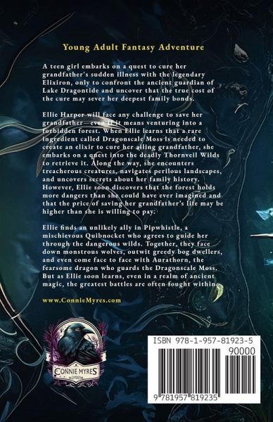 A teen girl embarks on a quest to cure her grandfather's sudden illness with the legendary Elixiron, only to confront the ancient guardian of Lake Dragontide and uncover that the true cost of the cure may sever her deepest family bonds. Ellie Harper will face any challenge to save her grandfather-even if it means venturing into a forbidden forest. When Ellie learns that a rare ingredient called Dragonscale Moss is needed to create an elixir to cure her ailing grandfather, she embarks on a quest into the deadly Thornveil Wilds to retrieve it. Along the way, she encounters treacherous creatures, navigates perilous landscapes, and uncovers secrets about her family history. However, Ellie soon discovers that the forest holds more dangers than she could have ever imagined and that the price of saving her grandfather's life may be higher than she is willing to pay. Ellie finds an unlikely ally in Pipwhistle, a mischievous Quibnocket who agrees to guide her through the dangerous wilds. Together, they face down monstrous wolves, outwit greedy bog dwellers, and even come face to face with Aurathorn, the fearsome dragon who guards the Dragonscale Moss. But as Ellie soon learns, even in a realm of ancient magic, the greatest battles are often fought within.