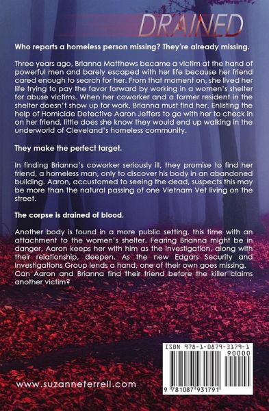 Who reports a homeless person missing? They're already missing. Three years ago, Brianna Matthews became a victim at the hand of powerful men and barely escaped with her life because her friend cared enough to search for her. From that moment on, she lived her life trying to pay the favor forward by working in a women's shelter for abuse victims. When her coworker and a former resident in the shelter doesn't show up for work, Brianna must find her. Enlisting the help of Homicide Detective Aaron Jeffers to go with her to check in on her friend, little does she know they would end up walking in the underworld of Cleveland's homeless community. They make the perfect target. In finding Brianna's coworker seriously ill, they promise to find her friend, a homeless man, only to discover his body in an abandoned building. Aaron, accustomed to seeing the dead, suspects this may be more than the natural passing of one Vietnam Vet living on the street. The corpse is drained of blood. Another body is found in a more public setting, this time with an attachment to the women's shelter. Fearing Brianna might be in danger, Aaron keeps her with him as the investigation, along with their relationship, deepen. As the new Edgars Security and Investigations Group lends a hand, one of their own goes missing. Can Aaron and Brianna find their friend before the killer claims another victim?