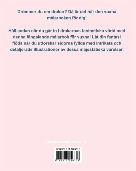 Drömmer du om drakar? Då är det här den vuxna målarboken för dig! Håll andan när du går in i drakarnas fantastiska värld med denna fängslande målarbok för vuxna! Låt din fantasi flöda när du utforskar sidorna fyllda med intrikata och detaljerade illustrationer av dessa majestätiska varelser.