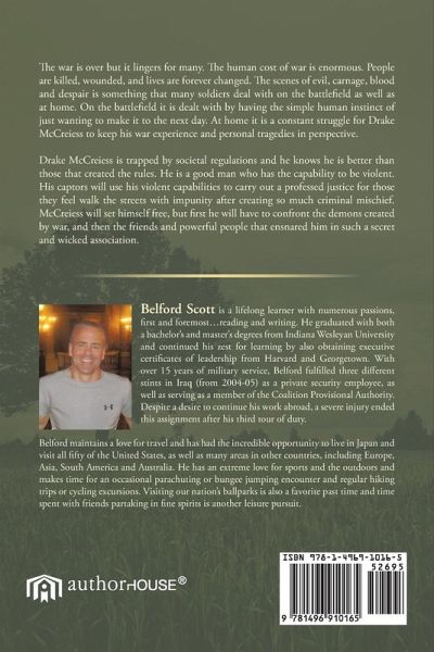 The war is over but it lingers for many. The human cost of war is enormous. People are killed, wounded, and lives are forever changed. The scenes of evil, carnage, blood and despair is something that many soldiers deal with on the battlefield as well as at home. On the battlefield it is dealt with by having the simple human instinct of just wanting to make it to the next day. At home it is a constant struggle for Drake McCreiess to keep his war experience and personal tragedies in perspective. Drake McCreiess is trapped by societal regulations and he knows he is better than those that created the rules. He is a good man who has the capability to be violent. His captors will use his violent capabilities to carry out a professed justice for those they feel walk the streets with impunity after creating so much criminal mischief. McCreiess will set himself free, but first he will have to confront the demons created by war, and then the friends and powerful people that ensnared him in such a secret and wicked association.