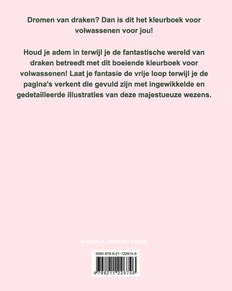 Dromen van draken? Dan is dit het kleurboek voor volwassenen voor jou! Houd je adem in terwijl je de fantastische wereld van draken betreedt met dit boeiende kleurboek voor volwassenen! Laat je fantasie de vrije loop terwijl je de pagina's verkent die gevuld zijn met ingewikkelde en gedetailleerde illustraties van deze majestueuze wezens.