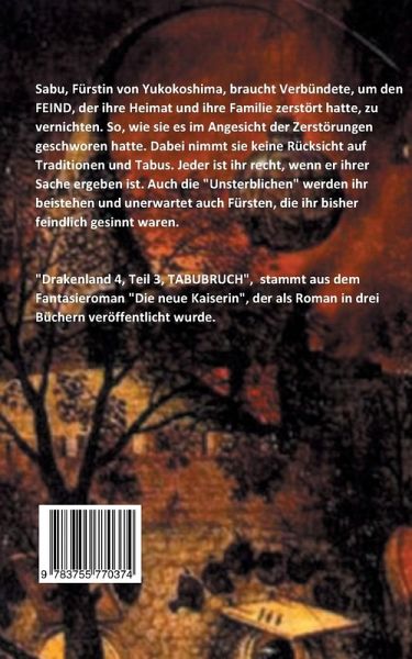 Sabu, Fürstin von Yukokoshima, braucht Verbündete, um den FEIND, der ihre Heimat und ihre Familie zerstört hatte, zu vernichten. So, wie sie es im Angesicht der Zerstörungen geschworen hatte. Dabei nimmt sie keine Rücksicht auf Traditionen und Tabus. Jeder ist ihr recht, wenn er ihrer Sache ergeben ist. Auch die "Unsterblichen" werden ihr beistehen und unerwartet auch Fürsten, die ihr bisher feindlich gesinnt waren."Drakenland 4, Teil 3, TABUBRUCH", stammt aus dem Fantasieroman "Die neue Kaiserin", der als Roman in drei Büchern veröffentlicht wurde.