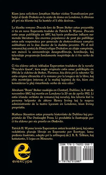 Kiam juna solicitoro Jonathan Harker vizitas Transilvanion por helpi al Grafo Drakulo en la äeto de domo en Londono, li eltrovas pli pri sia kliento kaj lia kastelo ol li eble dezirus... La klasika romano Dracula fare de Bram Stoker estas prezentita ¿i tie en nova Esperanta traduko de Patrick H. Wynne. Dracula estis unue publikigita en 1897, kaj havis profundan influon sur monda literaturo. ¿ia enorma populareco de post ¿ia publikigo estas sole respondeca por generado de eksterordinara vampira subkulturo en la dua duono de la dudeka jarcento. Pli ol mil romanoj kaj centoj da filmoj roligas Drakulon ä aliajn vampirojn, sen mencii la sennombrajn desegnofilmojn, komiksojn, kaj televidajn programojn fundamente inspiritajn de ¿i tiu verko de Stoker. ¿i tiu eldono ankä inkludas Esperantan tradukon de la novelo "Dracula's Guest", kies angla originalo estis unue publikigita en 1914 de la vidvino de Stoker, Florence, kiu diris pri la rakonto: "¿i estis origine eltran¿ita el la romano pro la longeco de la libro, kaj eble montri¿os interesa al la multaj legintoj de tio, kion oni konsideras la plej rimarkinda verko de mia edzo." Abraham "Bram" Stoker naski¿is en Clontarf, Dublino, la 8-an de novembro 1847, kaj mortis en Londono la 20-an de aprilo 1912. Li estis irlanda verkisto de romanoj kaj noveloj, kiu laboris kiel la persona helpanto de aktoro Henry Irving kaj la negoca administranto de la teatro Lyceum en Londono, kiun Irving proprietis. Mathew Staunton estas presarta historiisto de Dublino kaj proprietulo de The Onslaught Press. Li produktis la ilusträojn por ¿i tiu eldono per sia presilo en Oksfordo. Patrick H. Wynne lernis Esperanton antä kvardek jaroj, kaj estas redaktinta plurajn librojn en Esperanto por Evertype. Iama profesia ilustristo, adepto pri la artlingvoj de J. R. R. Tolkien, kaj kat¿atanto, li löas en Minesoto. ===== When estate agent solicitor's clerk Jonathan Harker visits Transylvania to assist Count Dracula with the purchase of his London house, he discovers more about his client and his castle than he might wish.... Bram Stoker's classic novel Dracula, originally titled The Un-Dead, was first published in 1897. It has had a profound influence on world literature. It has enjoyed enormous popularity since its publication and is singularly responsible for spawning an extraordinary vampire subculture in the second half of the twentieth century. Over a thousand novels and hundreds of films feature Dracula or other vampires, not to mention the countless cartoons, comics, and television programmes which were ultimately inspired by Stoker's work. This edition includes the short story "Dracula's Guest", which was published in 1914 by Stoker's widow, Florence, who said of the story: "It was originally excised owing to the length of the book, and may prove of interest to the many readers of what is considered my husband's most remarkable work." Abraham "Bram" Stoker was born in Clontarf in Dublin on 8 November 1847 and died in London on 20 April 1912. He was an Irish novelist and short story writer, who worked as the personal assistant of actor Henry Irving and business manager of the Lyceum Theatre in London, which Irving owned. Mathew Staunton is printing historian from Dublin and proprietor of The Onslaught Press. He produced the illustrations for this edition on his press in Oxford. Patrick H. Wynne learned Esperanto forty years ago, and has edited several books in Esperanto for Evertype. A former professional illustrator, adept at J. R. R. Tolkien's constructed languages, and a cat lover, he lives in Minnesota.