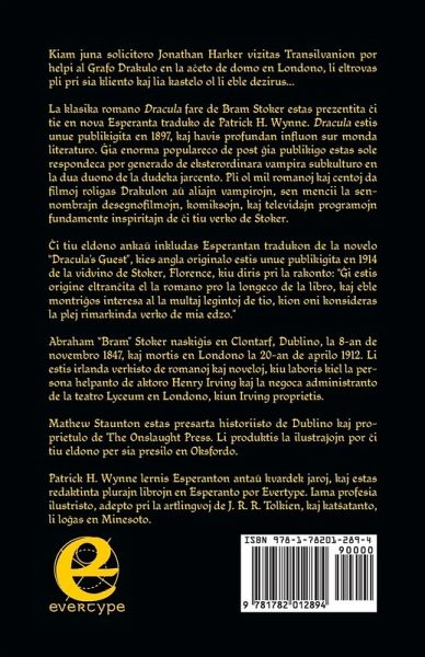 Kiam juna solicitoro Jonathan Harker vizitas Transilvanion por helpi al Grafo Drakulo en la äeto de domo en Londono, li eltrovas pli pri sia kliento kaj lia kastelo ol li eble dezirus... La klasika romano Dracula fare de Bram Stoker estas prezentita ¿i tie en nova Esperanta traduko de Patrick H. Wynne. Dracula estis unue publikigita en 1897, kaj havis profundan influon sur monda literaturo. ¿ia enorma populareco de post ¿ia publikigo estas sole respondeca por generado de eksterordinara vampira subkulturo en la dua duono de la dudeka jarcento. Pli ol mil romanoj kaj centoj da filmoj roligas Drakulon ä aliajn vampirojn, sen mencii la sennombrajn desegnofilmojn, komiksojn, kaj televidajn programojn fundamente inspiritajn de ¿i tiu verko de Stoker. ¿i tiu eldono ankä inkludas Esperantan tradukon de la novelo "Dracula's Guest", kies angla originalo estis unue publikigita en 1914 de la vidvino de Stoker, Florence, kiu diris pri la rakonto: "¿i estis origine eltran¿ita el la romano pro la longeco de la libro, kaj eble montri¿os interesa al la multaj legintoj de tio, kion oni konsideras la plej rimarkinda verko de mia edzo." Abraham "Bram" Stoker naski¿is en Clontarf, Dublino, la 8-an de novembro 1847, kaj mortis en Londono la 20-an de aprilo 1912. Li estis irlanda verkisto de romanoj kaj noveloj, kiu laboris kiel la persona helpanto de aktoro Henry Irving kaj la negoca administranto de la teatro Lyceum en Londono, kiun Irving proprietis. Mathew Staunton estas presarta historiisto de Dublino kaj proprietulo de The Onslaught Press. Li produktis la ilusträojn por ¿i tiu eldono per sia presilo en Oksfordo. Patrick H. Wynne lernis Esperanton antä kvardek jaroj, kaj estas redaktinta plurajn librojn en Esperanto por Evertype. Iama profesia ilustristo, adepto pri la artlingvoj de J. R. R. Tolkien, kaj kat¿atanto, li löas en Minesoto. ===== When estate agent solicitor's clerk Jonathan Harker visits Transylvania to assist Count Dracula with the purchase of his London house, he discovers more about his client and his castle than he might wish.... Bram Stoker's classic novel Dracula, originally titled The Un-Dead, was first published in 1897. It has had a profound influence on world literature. It has enjoyed enormous popularity since its publication and is singularly responsible for spawning an extraordinary vampire subculture in the second half of the twentieth century. Over a thousand novels and hundreds of films feature Dracula or other vampires, not to mention the countless cartoons, comics, and television programmes which were ultimately inspired by Stoker's work. This edition includes the short story "Dracula's Guest", which was published in 1914 by Stoker's widow, Florence, who said of the story: "It was originally excised owing to the length of the book, and may prove of interest to the many readers of what is considered my husband's most remarkable work." Abraham "Bram" Stoker was born in Clontarf in Dublin on 8 November 1847 and died in London on 20 April 1912. He was an Irish novelist and short story writer, who worked as the personal assistant of actor Henry Irving and business manager of the Lyceum Theatre in London, which Irving owned. Mathew Staunton is printing historian from Dublin and proprietor of The Onslaught Press. He produced the illustrations for this edition on his press in Oxford. Patrick H. Wynne learned Esperanto forty years ago, and has edited several books in Esperanto for Evertype. A former professional illustrator, adept at J. R. R. Tolkien's constructed languages, and a cat lover, he lives in Minnesota.