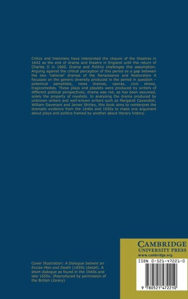 List of illustrations; A note on texts; Acknowledgements; Preface; Introduction: how the drama disappeared; Part I. 1642-1649: Cases in Politics and Drama: 1. New news for a new world? Genre politics and the news dialogues of the 1640s; 2. 'With the agreement of the people in their hands': transformations of radical drama in the 1640s; 3. Royalist versus Republican ethics and aesthetics; Interchapter: 'The Life of Action' playing on performance in the 1640s; Part II. The 1650s: Protectorate, Politics and Performance: 4. Gender and status in dramatic discourse; Margaret Cavendish, Duchess of Newcastle; 5. Royal or reformed? the politics of court entertainment in translation and performance; 6. national identity, topic and genre in Davenant's protectorate opera; 7. Genre, politics and place: the social body in the dramatic career of John Tatham; 8. True and loyal? politics and genre in Civil War and protectorate tragicomedy; Coda; Notes; Bibliography.