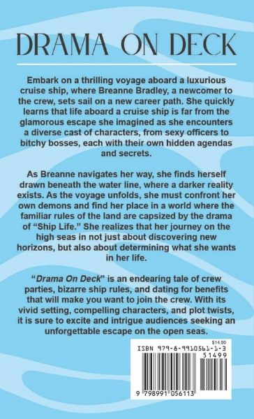 Embark on a thrilling voyage aboard a luxurious cruise ship, where Breanne Bradley, a newcomer to the crew, sets sail on a new career path. She quickly learns that life aboard a cruise ship is far from the glamorous escapade she imagined as she encounters a diverse cast of characters, from sexy officers to bitchy bosses, each with their own hidden agendas and secrets. As Breanne navigates her way through the intricacies of ship life, she finds herself drawn beneath the water line, where a darker reality exists. As the voyage unfolds, she must confront her own demons and find her place in a world where ex-boyfriends' names become passwords for one's digital world and the rules of the land are capsized by "Ship Life." She realizes that her journey on the high seas is not just about discovering new horizons but also about determining what she wants in her life. "Drama on Deck" is a tale of crew parties, bizarre ship rules, and dating for benefits that will make you want to join the crew. With its vivid setting, compelling characters, and plot twists, it is sure to excite and intrigue audiences seeking an unforgettable escape on the open seas.