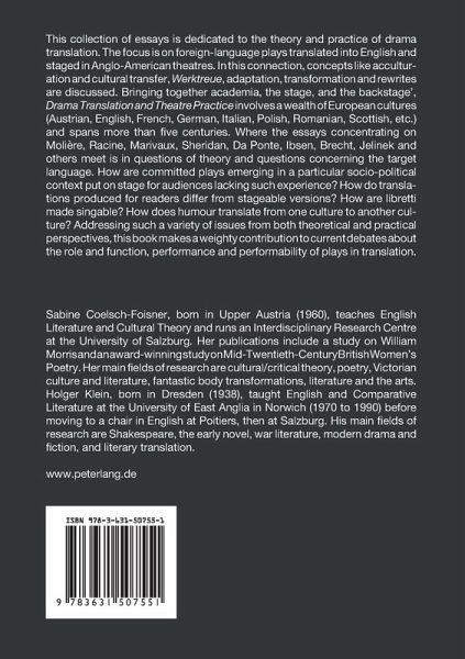 This collection of essays is dedicated to the theory and practice of drama translation. The focus is on foreign-language plays translated into English and staged in Anglo-American theatres. In this connection, concepts like acculturation and cultural transfer, Werktreue, adaptation, transformation and rewrites are discussed. Bringing together academia, the stage, and the 'backstage', Drama Translation and Theatre Practice involves a wealth of European cultures (Austrian, English, French, German, Italian, Polish, Romanian, Scottish, etc.) and spans more than five centuries. Where the essays concentrating on Molière, Racine, Marivaux, Sheridan, Da Ponte, Ibsen, Brecht, Jelinek and others meet is in questions of theory and questions concerning the target language. How are committed plays emerging in a particular socio-political context put on stage for audiences lacking such experience? How do translations produced for readers differ from stageable versions? How are libretti made singable? How does humour translate from one culture to another culture? Addressing such a variety of issues from both theoretical and practical perspectives, this book makes a weighty contribution to current debates about the role and function, performance and performability of plays in translation.